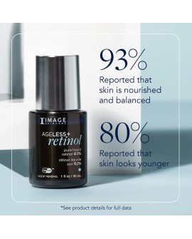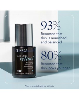 *Based on a 4-week clinical study of 30 participants ages 41 – 55, Fitzpatrick I-VI, new retinol users, with once daily application of AGELESS+ retinol pure liquid retinol 0.1%. Study data on file with Image International Manufacturing, LLC. Visual results following once daily
