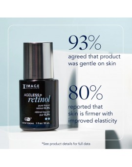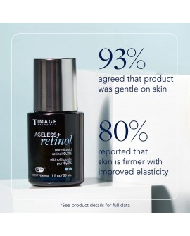 *Based on a 4-week clinical study of 30 participants ages 41 – 55, Fitzpatrick I-VI, new retinol users, with once daily application of AGELESS+ retinol pure liquid retinol 0.1%. Study data on file with Image International Manufacturing, LLC. Visual results following once daily