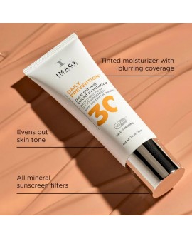 Cleanse with your IMAGE cleanser of choice, then apply your favorite IMAGE serum. Allow to absorb completely. Apply DAILY PREVENTION pure mineral tinted moisturizer SPF 30 generously 15 minutes before sun exposure. Reapply at least every 2 hours. Use a repair crème at night to nourish skin while you sleep.